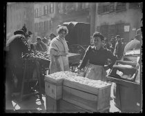 Original glass plate negative. View of an outdoor market on Hester Street on the Lower East Side of Manhattan, with buildings in the background. In the center of the image, two women stand next to wooden crates filled with eggs. At left a man (with his back to the camera) works at a grinding wheel, perhaps sharpening knives. Behind the women are a wagon filled with produce, and a horse-drawn carriage. The original negative sleeve has the photographer's handwritten inscription: "823 / Cramer / C / Egg stand group / Fine day bright / W.L. / 10.05 AM / Inst fast / Thursday April 18th 1895 / Hester Street." (Keywords: New York City) |